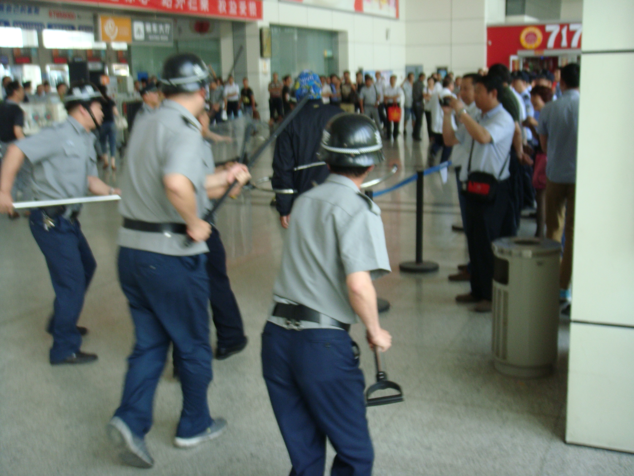 6月12日下午4點(diǎn)05分,演練模擬了揚(yáng)州汽車東站售票大廳里兩名手持砍刀的歹徒正往候車廳方向晃悠,值班保安發(fā)現(xiàn)這一險(xiǎn)情后,車站迅速啟動應(yīng)急預(yù)案,車站保衛(wèi)人員協(xié)同車站一線職工緊急疏散乘客,使乘客有序、安全撤離現(xiàn)場,隨即,6名防暴隊(duì)員手持鋼叉、齊眉棍、警棍,將兩名手拿砍刀的暴徒團(tuán)團(tuán)圍住,經(jīng)過短短幾分鐘的對持和搏斗,兩名歹徒終于被制服,并被隨后趕來的民警帶走……