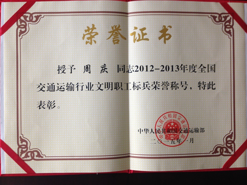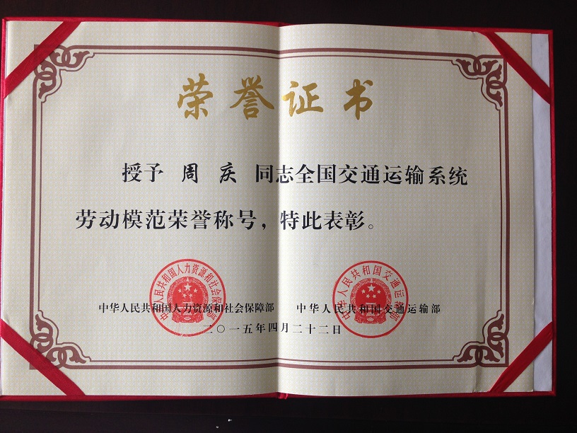 駕駛員周慶榮獲“全國交通運(yùn)輸系統(tǒng)勞動模范”稱號