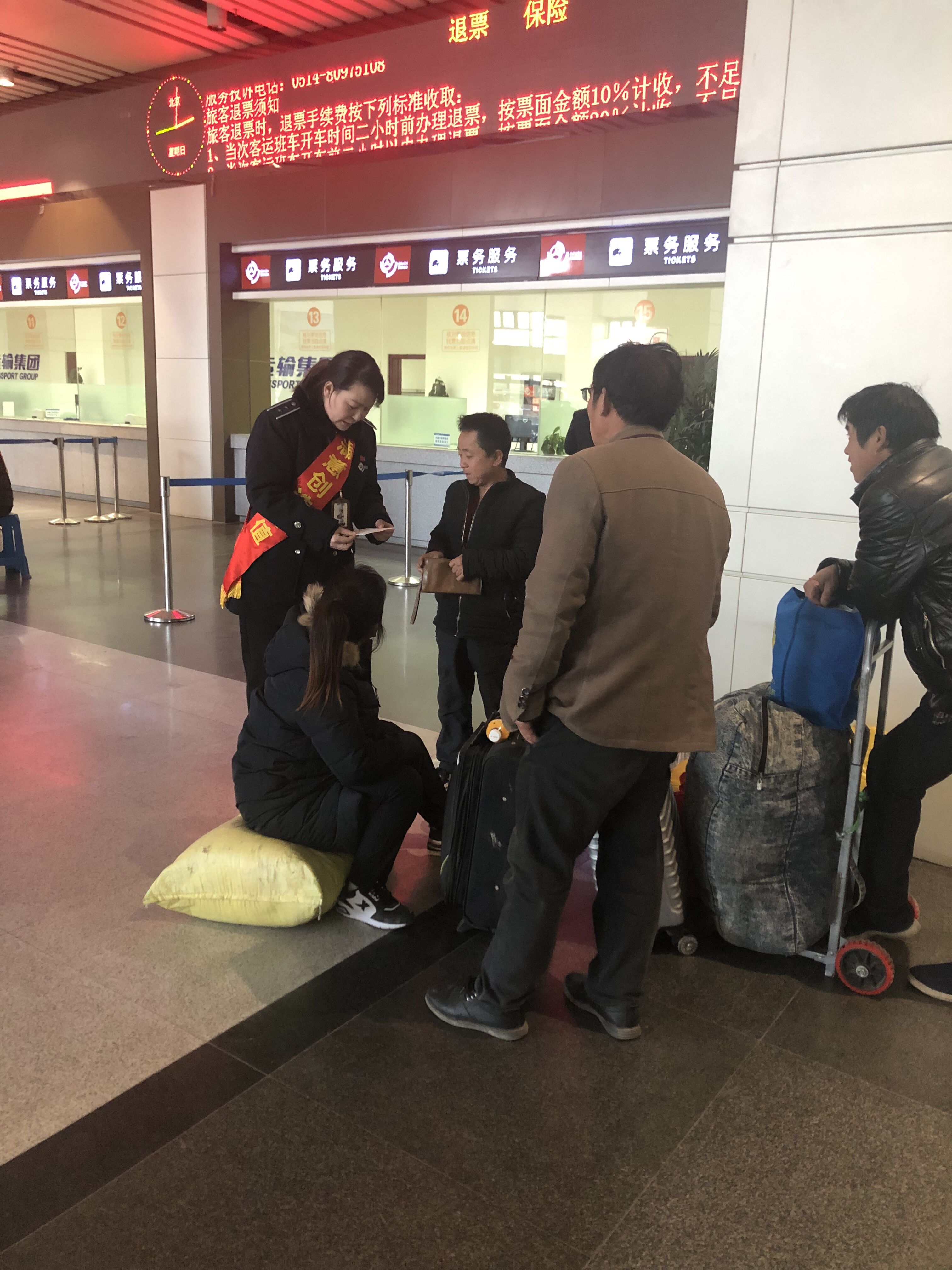 1月27日下午三點(diǎn),服務(wù)班班長尹海霞在現(xiàn)場(chǎng)巡查時(shí)發(fā)現(xiàn),售票大廳一角有四個(gè)農(nóng)民工模樣的旅客,望著眼前一大堆行李,說著外地方言,不停地議論著。
