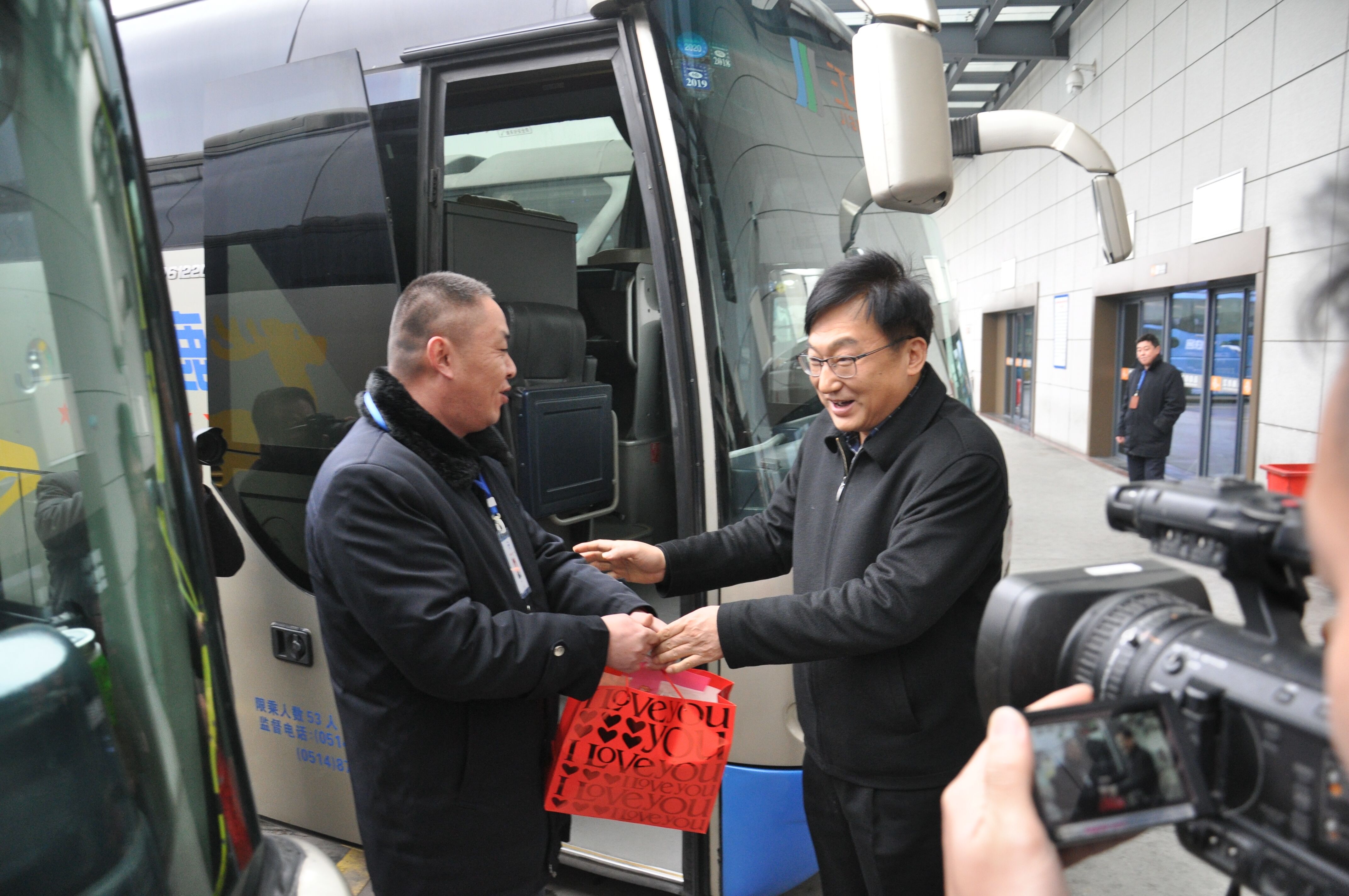 會(huì)議結(jié)束后,丁市長(zhǎng)一行前往公交和揚(yáng)汽的場(chǎng)站,對(duì)一線(xiàn)駕駛服務(wù)人員進(jìn)行慰問(wèn)。丁市長(zhǎng)還登上揚(yáng)汽的大巴車(chē),給旅客送上了象征吉祥如意的桔子,祝福大家一路平安,闔家幸福。