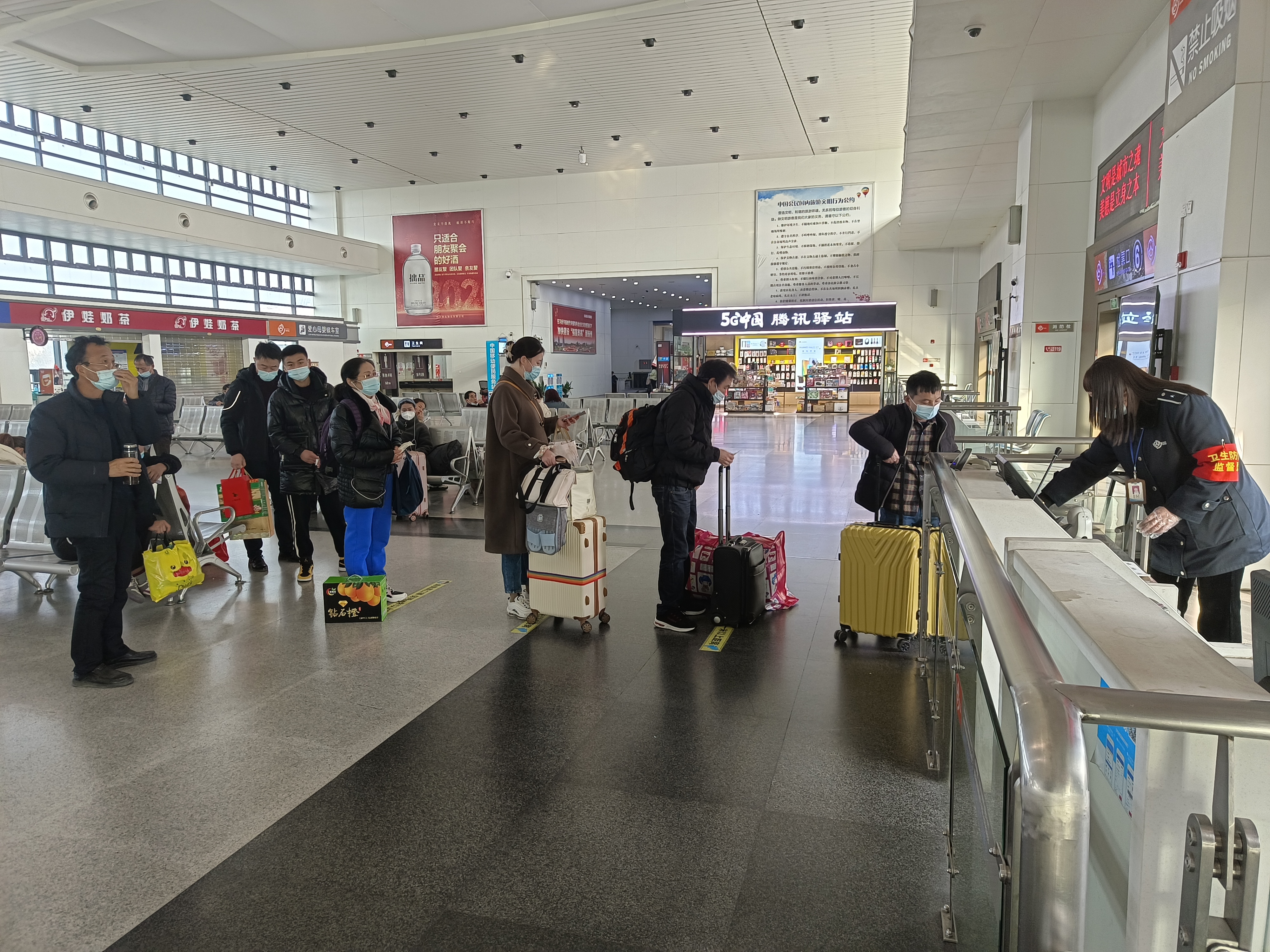 客流量雖然不多,但客運站在疫情防控方面并沒有放松警惕,時刻繃緊疫情防控這根弦,進出站口嚴格按照疫情防控各項舉措,工作人員引導旅客有序分散進站候車,主動出示健康碼、行程碼,進行掃碼測溫,同時提醒佩戴好口罩,做好個人防護,全力保障廣大旅客平安順利出行。