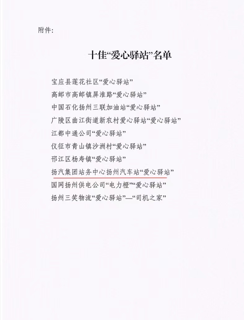 揚(yáng)州汽車客運(yùn)站榮獲市總工會十佳“愛心驛站”榮譽(yù)稱號
