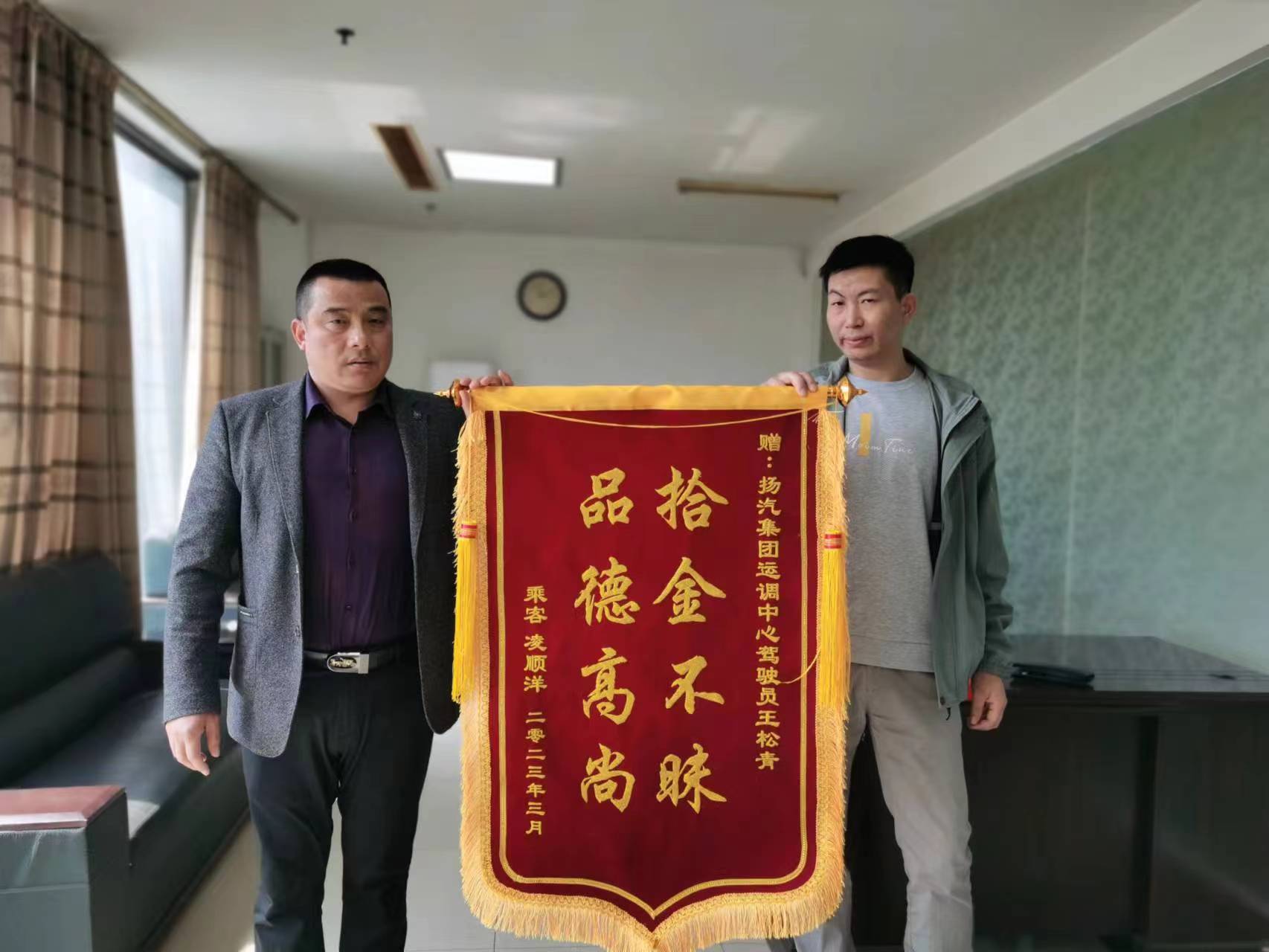 3月31日上午,市民凌先生來到江都汽車站,將一面印有“拾金不昧,品德高尚”的錦旗交到了分公司相關(guān)負責人的手上,以此來表達對駕駛員王松青師傅拾金不昧行為的感謝。